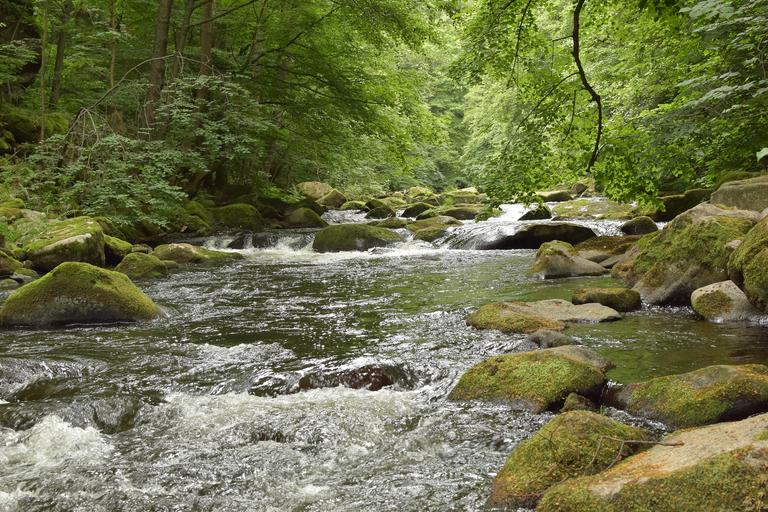 Keywords: bode river water stones idyllic mood forest trees green deciduous forest goethe hiking trail fluent waters rocks wet