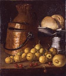 | Keywords: Bodegón de frutas y utensilios-Melendez.jpg title es Bodegón con frutas y utensilios oil Museo Cerralbo de Madrid http //museocerralbo mcu es/coleccion/galeriaDeImagenes/pintura html sala21 Creator Luis Eugenio Meléndez 1760-1765 PD-old-100 Luis Egidio Meléndez Museo Cerralbo Paintings in Madrid 1760s paintings in Spain Still life paintings of bread Paintings of fruit 1760s paintings from Spain Copper objects 1760s still life paintings Still life paintings in Spain | ||||