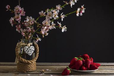 Keywords: bodegones still life rustic color spring leaves colors strawberries red wood vase bottles flowers