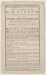 | Keywords: Bodleian Libraries, Advertisement of Lyceum Theatre (London, England), 1785, announcing A cabinet of royal figures. Most curiously moulded in wax.jpg Advertisement of Lyceum Theatre London England 1785 announcing A cabinet of royal figures Most curiously moulded in wax; Ladies and gentlemen may have their portraits taken in either wax or miniature by this artist Should the portraits not be thought the most striking and correct likenesses he will not expect any thing for his trouble ; Cabinet of royal figures Most curiously moulded in wax; Emperor of Germany Empress of Russia their Majesties of France Spain and Portugal with their respective families ; King of Prussia and the Prince of Orange at table in Council of War; Sleeping Venus; Hunting parties of Henry the IVth with the family of Meunier; Dido Queen of Tyre; Voltaire and other figures ; For the inspection of the curious At the Lyceum near Exeter Change in the Strand is an entire new exhibition just arrived from Paris containing a cabinet of royal figures Most curiously moulded in wax ; Lyceum Theatre Westminster London England ; Advertisement of Lyceum Theatre London England 1785 announcing A cabinet of royal figures Most curiously moulded in wax single sheet; 310 x 194 mm exhibition history 003682; t154030 object history object type Licensed-PD-Art PD-old-100 cc-by-4 0 place of creation place of discovery http //digital bodleian ox ac uk/inquire/p//b5e741be-d893-4e3c-ba64-7af87d19bb0f Digital Bodleian Template John Johnson Advertisement of Lyceum Theatre London England 1785 announcing A cabinet of royal figures Most curiously moulded in wax Uploaded with GWToolset Bodleian Libraries Advertisement of Lyceum Theatre London England 1785 announcing A cabinet of royal figures Most curiously moulded in wax http //iiif bodleian ox ac uk/iiif/image/b5e741be-d893-4e3c-ba64-7af87d19bb0f/full/ 1000 1000/0/default jpg Files uploaded by the Bodleian Libraries' Wikimedian In Residence Lyceum Theatre London |