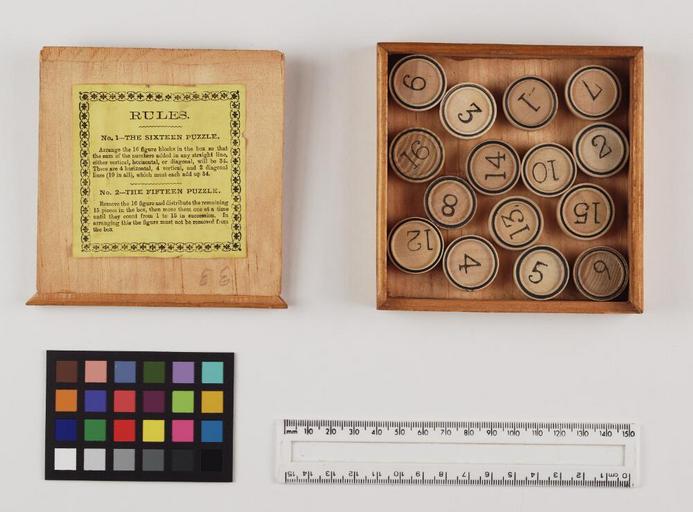 Keywords: Bodleian Libraries, Calculator puzzles. Two games in one.jpg Game entitled Calculator puzzles Two games in one; wooden box with circular wooden blocks numbered 1-16 Label on inside of lid with rules printed in yellow Box lid label printed in green; Regular posers; Sixteen puzzle no 1 ; Fifteen puzzle no 2 ; Image 2 box 16 discs; 115 x 115 x 26 mm exhibition history Allegro identifier 20040911/10 19 11 jl object history object type Licensed-PD-Art PD-old-100 cc-by-4 0 place of creation place of discovery http //digital bodleian ox ac uk/inquire/p//a327fbc9-8e01-410b-bac1-2235170f9139 Digital Bodleian Template John Johnson Calculator puzzles Two games in one Uploaded with GWToolset Bodleian Libraries Calculator puzzles Two games in one http //iiif bodleian ox ac uk/iiif/image/9a16bb53-f2a4-4583-bda5-e6a26b797977/full/ 1000 1000/0/default jpg Files uploaded by the Bodleian Libraries' Wikimedian In Residence Educational games Games in mathematics education