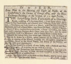 | Keywords: Bodleian Libraries, Exhibition of miniature furniture and objects at Mr. Boverick's, watchmaker.jpg Newscutting relating to the exhibition of miniature furniture and objects at Mr Boverick's watchmaker; 1785 manuscript ; Little furniture of a dining-room; Landau which opens and shuts by springs; Curious little four-wheel open chaise drawn by a flea; Flea chained by a chain of two hundred links ; Camel that passes through the eye fo a middle-size needle; Curious pair of steel scissars; Exhibition of miniature furniture and objects at Mr Boverick's watchmaker single sheet; 148 x 52 mm exhibition history To be seen at Mr Boverick's watch-maker at the Dial facing old round court near the New Exchange Buildings in the Strand at one shilling each person Allegro identifier 20030523/18 02 43 hm object history object type Licensed-PD-Art PD-old-100 cc-by-4 0 place of creation place of discovery http //digital bodleian ox ac uk/inquire/p//628c6796-e3a6-4c57-a686-f1fa80e1a676 Digital Bodleian Template John Johnson Exhibition of miniature furniture and objects at Mr Boverick's watchmaker Uploaded with GWToolset Bodleian Libraries Exhibition of miniature furniture and objects at Mr Boverick's watchmaker http //iiif bodleian ox ac uk/iiif/image/628c6796-e3a6-4c57-a686-f1fa80e1a676/full/ 1000 1000/0/default jpg Files uploaded by the Bodleian Libraries' Wikimedian In Residence Miniature objects Exhibitions Music Furniture Tableware Carriages and carts Siphonaptera Scissors and shears Clippings 1785 documents 1780s advertisements |