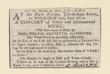 | Keywords: Bodleian Libraries, For the benefit of Miss Abrams.jpg Newscutting relating to the New Rooms Tottenham-Street announcing Vocal and instrumental music for the benefit of Miss Abrams; Vocal and instrumental music; For the benefit of Miss Abrams single sheet; 45 x 70 mm exhibition history At the New Rooms Tottenham-Street on Wednesday next there will be a concert of vocal and instrumental music Allegro identifier 20030603/12 55 27 hm object history object type Licensed-PD-Art PD-old-100 cc-by-4 0 place of creation place of discovery http //digital bodleian ox ac uk/inquire/p//82c5cc01-04db-486a-b7f2-de6d985e39fd Digital Bodleian Template John Johnson For the benefit of Miss Abrams Uploaded with GWToolset Bodleian Libraries For the benefit of Miss Abrams http //iiif bodleian ox ac uk/iiif/image/82c5cc01-04db-486a-b7f2-de6d985e39fd/full/ 1000 1000/0/default jpg Files uploaded by the Bodleian Libraries' Wikimedian In Residence Singing Instrumental music Clippings Concerts in London |