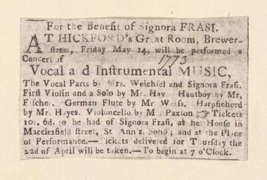 | Keywords: Bodleian Libraries, For the benefit of Signora Frasi.jpg Newscutting relating to Hickford's Great Room Friday May 14th announcing A concert of vocal and instrumental music for the benefit of Signora Frasi; Concert of vocal and instrumental music; For the benefit of Signora Frasi single sheet; 38 x 63 mm exhibition history At Hickford's Great Room Brewer Street Friday May 14 will be performed a concert of vocal and instrumental music Allegro identifier 20030602/10 32 46 hm object history object type Licensed-PD-Art PD-old-100 cc-by-4 0 place of creation place of discovery http //digital bodleian ox ac uk/inquire/p//1a605eaf-88d8-47ad-803c-51f37483482b Digital Bodleian Template John Johnson For the benefit of Signora Frasi Uploaded with GWToolset Bodleian Libraries For the benefit of Signora Frasi http //iiif bodleian ox ac uk/iiif/image/1a605eaf-88d8-47ad-803c-51f37483482b/full/ 1000 1000/0/default jpg Files uploaded by the Bodleian Libraries' Wikimedian In Residence Concerts in London Singing Violin with instrumental ensemble Flute with instrumental ensemble Oboes Harpsichord Cellos Clippings |