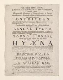 | Keywords: Bodleian Libraries, Handbill announcing Two stupendous and royal ostriches.jpg Handbill announcing Two stupendous and royal ostriches; Two stupendous and royal ostriches; Five beautiful maccaws and a cockatoo; Noble hee Bengal tyger; Beautiful young lioness; Hee spotted laughing hyena; Ravenous wolfe; Two ring-tail porcupines; African ram; Handbill announcing Two stupendous and royal ostriches single sheet; 248 x 187 mm exhibition history For this day only Just arrived from the Lyceum and Exeter-Change Strand London the grandest assemblage of living rarities in Europe Allegro identifier 20030512/17 19 40 hm object history object type Licensed-PD-Art PD-old-100 cc-by-4 0 place of creation place of discovery http //digital bodleian ox ac uk/inquire/p//bd69b660-dcaf-4db9-8e77-d88f5548bf6f Digital Bodleian Template John Johnson Handbill announcing Two stupendous and royal ostriches Uploaded with GWToolset Bodleian Libraries Handbill announcing Two stupendous and royal ostriches http //iiif bodleian ox ac uk/iiif/image/bd69b660-dcaf-4db9-8e77-d88f5548bf6f/full/ 1000 1000/0/default jpg Files uploaded by the Bodleian Libraries' Wikimedian In Residence Tigers in art Parrots in art Panthera leo Hyaenidae Wolves Rams Exhibitions West Bengal Cape Horn Chile Lisbon Portugal Animals performing tricks |
