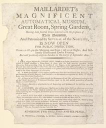 | Keywords: Bodleian Libraries, Handbill for the Great Room, Spring Gardens, 1800, announcing Maillardet's Magnificent Automatical Museum.jpg Handbill for the Great Room Spring Gardens 1800 announcing Maillardet's Magnificent Automatical Museum; announcement of closure Torn Some fragments missing with no loss of text; Date on mount c 1798 ; Maillardet's Magnificent Automatical Museum; Elegant figure of a young lady seated at an organ; Rope dancer; Figure of a child; Conjurer; Gold box from which a bird suddenly darts; Exact representation of that rare and beautiful insect called Aranea; Curculio imperialis from the Brazils; Maillardet's Magnificent Automatical Museum Great Room Spring Gardens having been several times honored with the presence of Their Majesties and patronized by several nobility is now open for public inspection But will positively close in London in the course of September 1801; Handbill for the Great Room Spring Gardens 1800 announcing Maillardet's Magnificent Automatical Museum single sheet; 230 x 187 mm exhibition history 003368; t188708 object history object type Licensed-PD-Art PD-old-100 cc-by-4 0 place of creation London England Woodfall T place of discovery http //digital bodleian ox ac uk/inquire/p//b8c01840-3db8-436e-92ae-6972dd4e74a0 Digital Bodleian Template John Johnson Handbill for the Great Room Spring Gardens 1800 announcing Maillardet's Magnificent Automatical Museum Uploaded with GWToolset Bodleian Libraries Handbill for the Great Room Spring Gardens 1800 announcing Maillardet's Magnificent Automatical Museum http //iiif bodleian ox ac uk/iiif/image/b8c01840-3db8-436e-92ae-6972dd4e74a0/full/ 1000 1000/0/default jpg Files uploaded by the Bodleian Libraries' Wikimedian In Residence Robots Musical instruments Model building |