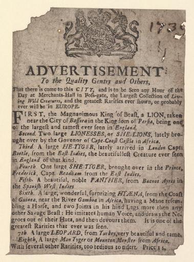 | Keywords: Bodleian Libraries, Handbill of Merchant's Hall, 1739, announcing A lion, lionesses, tigers, etc..jpg Handbill of Merchant's Hall 1739 announcing A lion lionesses tigers etc ; with several other rarities too tedious to mention ; 1739 manuscript ; Lion; Two large lionesses or she-lions; Large he-tiger; One large she-tiger; Beautiful noble panther; Large wonderful surprizing hyena; Large leopard; Large man tyger or Mounton Monster from Africa; Handbill of Merchant's Hall 1739 announcing A lion lionesses tigers etc single sheet; 171 x 121 mm exhibition history Advertisement to the quality gentry and others that there is come to this city and is to be seen any hour of the day at Merchant's-Hall in Poss-gate the largest collection of living wild creatures and the greatest rarities ever shown or probably ever will be in Europe Allegro identifier 20030512/15 57 15 hm object history object type Licensed-PD-Art PD-old-100 cc-by-4 0 place of creation place of discovery http //digital bodleian ox ac uk/inquire/p//c42adb26-e3e1-4def-8885-51640c4f7057 Digital Bodleian Template John Johnson Handbill of Merchant's Hall 1739 announcing A lion lionesses tigers etc Uploaded with GWToolset Bodleian Libraries Handbill of Merchant's Hall 1739 announcing A lion lionesses tigers etc http //iiif bodleian ox ac uk/iiif/image/c42adb26-e3e1-4def-8885-51640c4f7057/full/ 1000 1000/0/default jpg Files uploaded by the Bodleian Libraries' Wikimedian In Residence Panthera leo Tigers in art Panthers Hyaenidae Panthera pardus Animals in art Exhibitions Iran East Indies Buenos Aires Argentina New Guinea Turkey Engravings of coats of arms to be classified Animals performing tricks Royal coats of arms |