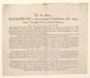 | Keywords: Bodleian Libraries, Handbill of Rackstrow's anatomical exhibition announcing a figure moulded from a woman, dissected after execution, for the muscles, ....jpg Handbill of Rackstrow's anatomical exhibition announcing a figure moulded from a woman dissected after execution for the muscles ; a proper person to attend the ladies ; Figure moulded from a woman dissected after execution for the muscles ; Woman seven months gone with child as if opened alive; Collection of real anatomical preparations; Great variety of skeletons; Stupendous skeleton of a whale; Figures of those two prodigies Mr Bamford the late giant and the Nofolk dwarf moulded from them when alive; Hide of the rhinoceros; Grand figure of his late Majesty King George the second in his royal robes; Several other great personages; Imitation of the Imperial crown and other jewels worn by his Majesty in the Parliament House; To be seen Rackstrow's anatomical exhibition no 197 near Temple-Bar Fleet-Street; in the first room A figure moulded from a woman dissected after execution for the muscles ; Rackstrow Benjamin d 1772; Handbill of Rackstrow's anatomical exhibition announcing a figure moulded from a woman dissected after execution for the muscles single sheet; 158 x 188 mm exhibition history 003922; t192641 object history object type Licensed-PD-Art PD-old-100 cc-by-4 0 place of creation London England Hardy Henry I place of discovery http //digital bodleian ox ac uk/inquire/p//a7676f0e-8dff-4d1f-89ec-ee7ad62303e1 Digital Bodleian Template John Johnson Handbill of Rackstrow's anatomical exhibition announcing a figure moulded from a woman dissected after execution for the muscles Uploaded with GWToolset Bodleian Libraries Handbill of Rackstrow's anatomical exhibition announcing a figure moulded from a woman dissected after execution for the muscles http //iiif bodleian ox ac uk/iiif/image/a7676f0e-8dff-4d1f-89ec-ee7ad62303e1/full/ 1000 1000/0/default jpg Files uploaded by the Bodleian Libraries' Wikimedian In Residence Human anatomy Models Dissection Exhibitions Whales Foetuses Dwarfism Tall people Rhinoceros Waxworks plastic arts Bamford Mr |