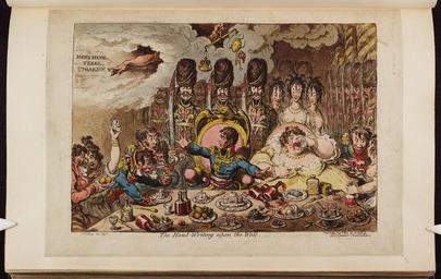 | Keywords: Bodleian Libraries, The handwriting upon the wall.jpg accession number Curzon b 22 55 Creator James Gillray artist Caricature of Napoleon I British political cartoon ; Napoleon and Josephine feast on English dishes including the Tower of London and the Bank of England representing the threat to invade Napoleon looks in horror at the prophetic handwriting on the wall to which the hand of God is pointing Above the First Consuls head God's other hand holds a pair of scales in which the crown of France weighs heavier than the cap of liberty under which Napoleon's despotism has been concealed 253 x 354 platemark ; 249 x 348 image and text mm exhibition history Source filename politi004-atz-0001-0 object history object type Licensed-PD-Art PD-old-100 cc-by-4 0 place of creation London England Hannah Humphrey place of discovery http //digital bodleian ox ac uk/inquire/p//6a3c10fa-30f6-4498-a262-8ce9cf463c29 Digital Bodleian Template Bodleian Libraries The hand-writing upon the wall Uploaded with GWToolset Bodleian Libraries The handwriting upon the wall http //iiif bodleian ox ac uk/iiif/image/6a3c10fa-30f6-4498-a262-8ce9cf463c29/full/ 1000 1000/0/default jpg Files uploaded by the Bodleian Libraries' Wikimedian In Residence Napoleonic Wars Arthur O'Connor Caricatures of Napoleon I of France Elisa Baciocchi Pauline Bonaparte Caroline Bonaparte Joséphine de Beauharnais Dreaming in art Phrygian caps in caricature God in caricatures Curzon Collection |