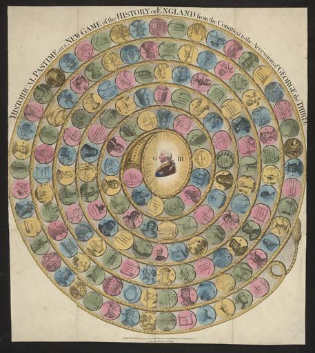 Keywords: Bodleian Libraries, Historical pastime or a new game of the history of England from the Conquest to the Accession of George the Third.jpg Game of 1803 entitled Historical pastime or a new game of the history of England from the Conquest to the Accession of George the Third; has 158 circles each depicting an aspect or event of history The first twenty are indexed as examples; New game of the history of England from the Conquest to the Accession of George the Third; Hastings; W I 1066; Briton; Norman; Dooms-day book; New Forest; Holy Land; W II 1087; Robert D of Normandy; Royal Forest; Death of Wm ; H I 1100; Henry seizing his brother's treasures; Anselm; Will; S 1135; War; Matilda; H II 1154; Becket assassinated by four barons; Historical pastime or a new game of the history of England from the Conquest to the Accession of George the Third single sheet; 556 x 493 mm exhibition history 006894 object history object type Licensed-PD-Art PD-old-100 cc-by-4 0 place of creation London England Harris J ; London England Wallis J place of discovery http //digital bodleian ox ac uk/inquire/p//32bb9aa4-43ce-4bf7-b0fb-c9452ca8e40c Digital Bodleian Template John Johnson Historical pastime or a new game of the history of England from the Conquest to the Accession of George the Third Uploaded with GWToolset Bodleian Libraries Historical pastime or a new game of the history of England from the Conquest to the Accession of George the Third http //iiif bodleian ox ac uk/iiif/image/32bb9aa4-43ce-4bf7-b0fb-c9452ca8e40c/full/ 1000 1000/0/default jpg Files uploaded by the Bodleian Libraries' Wikimedian In Residence Game boards |