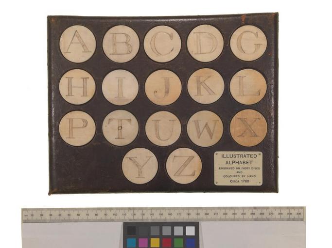 | Keywords: Bodleian Libraries, Illustrated alphabet engraved on ivory discs and coloured by hand.jpg Game of 1760 entitled Illustrated alphabet engraved on ivory discs and coloured by hand; has leather-covered board with 17 holes and 17 ivory discs; Apple A; Ball B; Cow C; Dog D; Goose G; Hen H; Inn I; Jay J; Kite K; Lark L; Pear P; Top T; Urn U; Whip W; Xerxes X; Yacht Y; Zebra Z; Image 2 board 17 disks; 192 x 249 x 8 mm exhibition history 007105 object history object type Licensed-PD-Art PD-old-100 cc-by-4 0 place of creation place of discovery http //digital bodleian ox ac uk/inquire/p//86d4e91b-ca82-4d62-aafa-3d0cc45f6c4c Digital Bodleian Template John Johnson Illustrated alphabet engraved on ivory discs and coloured by hand Uploaded with GWToolset Bodleian Libraries Illustrated alphabet engraved on ivory discs and coloured by hand http //iiif bodleian ox ac uk/iiif/image/b13b129a-1bc9-413b-8bde-4c81b41b5fa3/full/ 1000 1000/0/default jpg Files uploaded by the Bodleian Libraries' Wikimedian In Residence Illustrated alphabets Educational games 1760 |