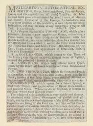 | Keywords: Bodleian Libraries, Maillardet's automatical exhibition.jpg Newscutting relating Maillardet's automatical exhibition; Elegant figure of a young lady which plays fourteen airs on a new constructed organ resembling a Piano-Forte; Rope-dancer; Conjuror; Two birds in a cage; Gold box with mechanical bird; Maillardet's automatical exhibition single sheet; 101 x 70 mm exhibition history Allegro identifier 20030605/11 16 07 hm object history object type Licensed-PD-Art PD-old-100 cc-by-4 0 place of creation place of discovery http //digital bodleian ox ac uk/inquire/p//d9e4c514-3a84-4fc0-8e3e-6ceb3e9a26d2 Digital Bodleian Template John Johnson Maillardet's automatical exhibition Uploaded with GWToolset Bodleian Libraries Maillardet's automatical exhibition http //iiif bodleian ox ac uk/iiif/image/d9e4c514-3a84-4fc0-8e3e-6ceb3e9a26d2/full/ 1000 1000/0/default jpg Files uploaded by the Bodleian Libraries' Wikimedian In Residence Mechanical toys Exhibitions Musical instruments Kings Clippings automata |