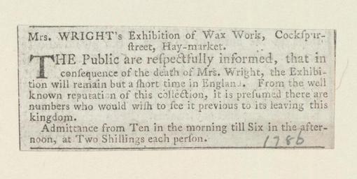 | Keywords: Bodleian Libraries, Mrs. Wright's exhibition of wax work, Cockspur-street, Hay-market.jpg Newscutting relating to Mrs Wright's exhibition of waxworks; 1786 manuscript ; Mrs Wright's exhibition of waxworks; Mrs Wright's exhibition of wax work Cockspur-street Hay-market single sheet; 27 x 71 mm exhibition history Public are respectfully informed that in consequence of the death of Mrs Wright the exhibition will remain but a short time in England Allegro identifier 20030527/17 00 52 hm object history object type Licensed-PD-Art PD-old-100 cc-by-4 0 place of creation place of discovery http //digital bodleian ox ac uk/inquire/p//019a5fce-73e5-46fd-ae5d-a343c474206a Digital Bodleian Template John Johnson Mrs Wright's exhibition of wax work Cockspur-street Hay-market Uploaded with GWToolset Bodleian Libraries Mrs Wright's exhibition of wax work Cockspur-street Hay-market http //iiif bodleian ox ac uk/iiif/image/019a5fce-73e5-46fd-ae5d-a343c474206a/full/ 1000 1000/0/default jpg Files uploaded by the Bodleian Libraries' Wikimedian In Residence Exhibitions Waxworks plastic arts Clippings Wright Mrs |