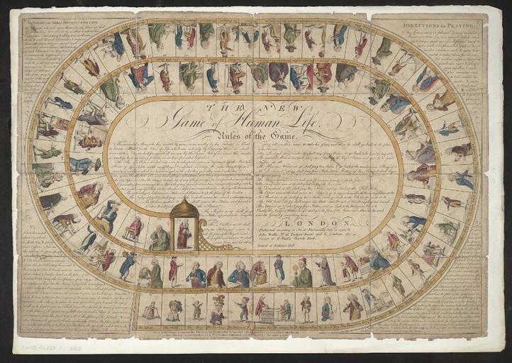 | Keywords: Bodleian Libraries, New game of human life.jpg Game of 1790 entitled The new game of human life; NB It is necessary to inform the purchaser that the totum must be marked with figures 1 2 3 4 5 6 to avoid introducing a dice box into private families each player must spin twice which will answer the same purpose Has rules in centre of board; Infant; Child; Boy; Darling; Mischievous boy; Careless boy; Seditious boy; Malignant boy; Docile boy; Thoughtless boy; Negligent boy; Youth; Volunteer; Indolent youth; Assiduous youth; Obstinate youth; Rebellious youth; Gallant; Trifler; Lover; Idler; Duellist; Dissembler; Young man; Decisive man; Complaisant man; Downright man; Flatterer; Critic; Prodigal; Coxcomb; Generous man; Oconomist; Married man; Batchelor; Prime of life; Author; Songster; Historian; Romance writer; Poet; Orator; Comic author; Dramatist; Tragic author; Traveller; Geographer; Sedate man; Imperious man; Affable man; Morose man; Benevolent man; Insensible man; Vigilant man; Patriot; Good father; Ambitious man; Temperate man; Glutton; Old man; Libertine; Philosopher; Drunkard; Miser; Gambler; Learned man; Brute; Patient man; Vindictive man; Friend of man; Man hater; Decrepitude; Sloven; Old bean; Hasty man; Hypochondriac; Satyrist; Joker; Silent man; Merry fellow; Troublesome companion; Quiet man; Thoughtful man; Immortal man; New game of human life single sheet; 465 x 677 mm exhibition history Utility and moral tendency of this game Games folder 2 ; 006863 object history object type Licensed-PD-Art PD-old-100 cc-by-4 0 place of creation London England Wallis J ; London England Newbery E place of discovery http //digital bodleian ox ac uk/inquire/p//5d278a5d-d7fc-430e-9d48-957d7280fc7e Digital Bodleian Template John Johnson New game of human life Uploaded with GWToolset Bodleian Libraries New game of human life http //iiif bodleian ox ac uk/iiif/image/5d278a5d-d7fc-430e-9d48-957d7280fc7e/full/ 1000 1000/0/default jpg Files uploaded by the Bodleian Libraries' Wikimedian In Residence Game boards Life cycle Human |