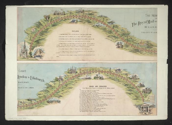 | Keywords: Bodleian Libraries, New game of the Royal Mail or London to Edinburgh by L & N.W. railway.jpg Game entitled The new game of the Royal Mail or London to Edinburgh by L N W railway; Royal mail; London to Edinburgh by L N W railway; Rules and penalties to be observed by players on arriving at the stations named; No 3 Harrow - pay 3 stakes and visit Harrow Schools; No 5 Bushey - pay 1 stake to see the church; No 9 Berkhamstead - pay 2 stakes to see the castle; No 14 Wolverton - pay 2 stakes remain here one turn to visit the Railway Carriage Works; No 20 Rugby - pay 1 stake and visit Rugby School; No 24 Nuneaton - remain here while other players throw twice and make a visit to Burton-on-Trent; No 28 Lichfield - pay 2 stakes and visit the Cathedral; No 33 Stafford - exchange places with the engine furthest in advance; No 40 Crewe - remain here until every player has passed and visit the N W Railway engine works; No 47 Warrington - pay 6 stakes towards Ship Canal expenses; No 50 Wigan - pay 1 stake to visit the Coal Mines; No 57 Preston - pay 3 stakes and remain here two turns to dine; No 64 Lancaster - pay 1 stake and visit the Castle; No 70 Oxenholme - pay a visit to the Lakes and return engine to Preston; No 74 Shap - pay 2 stakes for an extra engine to take train over Shap Fells; No 76 Penrith - remain here one turn and visit Druidical Remains; No 81 Carlisle - pay 1 stake to visit the Castle; No 84 Visit the Smithy and go back to London and begin again; No 92 Beattock - wait one turn and visit the Moffat Valley; No 97 Carstairs - remain here one turn to give up tickets; Mo 104 Edinburgh - wins the game and takes all the contents of the pool; New game of the Royal Mail or London to Edinburgh by L N W railway single sheet; 230 x 1200 mm exhibition history 006823 object history object type Licensed-PD-Art PD-old-100 cc-by-4 0 place of creation London England Jaques Son place of discovery http //digital bodleian ox ac uk/inquire/p//3ba6940f-aa7e-448d-9405-b620d66ba79a Digital Bodleian Template John Johnson New game of the Royal Mail or London to Edinburgh by L N W railway Uploaded with GWToolset Bodleian Libraries New game of the Royal Mail or London to Edinburgh by L N W railway http //iiif bodleian ox ac uk/iiif/image/3ba6940f-aa7e-448d-9405-b620d66ba79a/full/ 1000 1000/0/default jpg Files uploaded by the Bodleian Libraries' Wikimedian In Residence London and North Western Railway Board games Rail transport in art Historical objects of London London Borough of Harrow in art Berkhamsted Rugby Warwickshire Nuneaton Lichfield Cathedral Stafford Crewe Warrington Wigan Preston Lancashire Lancaster Lancashire Shap Fells Penrith Cumbria Carlisle Cumbria Gretna Green Lockerbie Carstairs Edinburgh Royal Mail Bushey Wolverton Oxenholme Beattock |