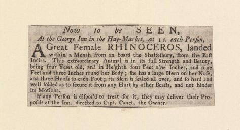 | Keywords: Bodleian Libraries, Now to be seen, at the George Inn at the Hay-market, at 1s, each person.jpg Newscutting relating to the George Inn announcing a Rhinoceros; Rhinoceros; Now to be seen at the George Inn at the Hay-market at 1s each person single sheet; 35 x 80 mm exhibition history Great female rhinoceros landed within the month from on board the Shaftesbury from the East Indies Allegro identifier 20030530/12 23 59 hm object history object type Licensed-PD-Art PD-old-100 cc-by-4 0 place of creation place of discovery http //digital bodleian ox ac uk/inquire/p//0b04b27b-ab26-4eee-8f57-95a7a3bee623 Digital Bodleian Template John Johnson Now to be seen at the George Inn at the Hay-market at 1s each person Uploaded with GWToolset Bodleian Libraries Now to be seen at the George Inn at the Hay-market at 1s each person http //iiif bodleian ox ac uk/iiif/image/0b04b27b-ab26-4eee-8f57-95a7a3bee623/full/ 1000 1000/0/default jpg Files uploaded by the Bodleian Libraries' Wikimedian In Residence Rhinoceros Animals in art Exhibitions Clippings East Indies Animals performing tricks |