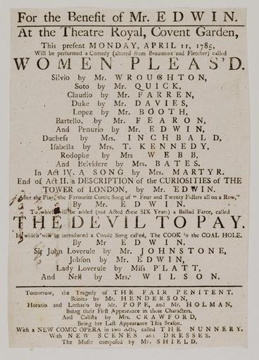 | Keywords: Bodleian Libraries, Playbill of Covent Garden, Monday, April 11, 1785, announcing Women pleas'd &c..jpg of the curiosities of the Tower of London; Four and twenty fidlers all on a row; Devil to pay; Cook in the coal hole; Fair penitent; Nunnery; Playbill of Covent Garden Monday April 11 1785 announcing Women pleas'd c single sheet; 232 x 164 mm exhibition history For the benefit of Mr Edwin Allegro identifier 20010704/14 21 31 af object history object type Licensed-PD-Art PD-old-100 cc-by-4 0 place of creation s l England s n place of discovery http //digital bodleian ox ac uk/inquire/p//65d7e237-c3a8-4080-90d0-c2fc468c7ea8 Digital Bodleian Template John Johnson Playbill of Covent Garden Monday April 11 1785 announcing Women pleas'd c Uploaded with GWToolset Bodleian Libraries Playbill of Covent Garden Monday April 11 1785 announcing Women pleas'd c http //iiif bodleian ox ac uk/iiif/image/65d7e237-c3a8-4080-90d0-c2fc468c7ea8/full/ 1000 1000/0/default jpg Files uploaded by the Bodleian Libraries' Wikimedian In Residence Playbills comedy Tower of London |