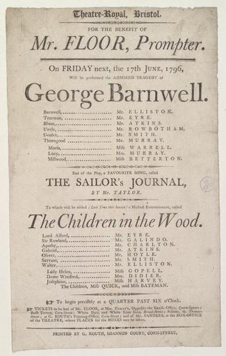 | Keywords: Bodleian Libraries, Playbill of the Theatre Royal, Friday next, the 17th June 1796, announcing George Barnwell.jpg Playbill of the Theatre Royal Friday next the 17th June 1796 announcing George Barnwell for the benefit of Mr Floor; George Barnwell; Sailor's journal; Children in the wood; Playbill of the Theatre Royal Friday next the 17th June 1796 announcing George Barnwell single sheet; 287 x 177 mm exhibition history For the benefit of Mr Floor prompter 010969 object history object type Licensed-PD-Art PD-old-100 cc-by-4 0 place of creation Bristol England Routh G place of discovery http //digital bodleian ox ac uk/inquire/p//ba7583d4-0c0a-4cb9-ba5d-c0d2d501eb4b Digital Bodleian Template John Johnson Playbill of the Theatre Royal Friday next the 17th June 1796 announcing George Barnwell Uploaded with GWToolset Bodleian Libraries Playbill of the Theatre Royal Friday next the 17th June 1796 announcing George Barnwell http //iiif bodleian ox ac uk/iiif/image/ba7583d4-0c0a-4cb9-ba5d-c0d2d501eb4b/full/ 1000 1000/0/default jpg Files uploaded by the Bodleian Libraries' Wikimedian In Residence Theater England--Bristol--History--18th century Playbills Tragedies |
