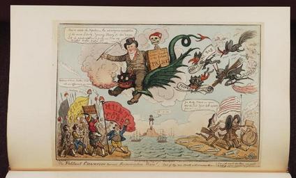 | Keywords: Bodleian Libraries, The political champion turned resurrection man- Out of thy own mouth will I condemn thee.jpg British political cartoon; Satire on Cobbett's retrieval of the bones of Paine from America Napoleon watches from St Helena as Britain erupts in revolution ; Initialled at lower left I R C fecit ; No XX 1 print; 267 x 368 mm; 232 x 285 mm; etching exhibition history Source filename modhis001-avr-0001-0 object history object type Licensed-PD-Art PD-old-100 cc-by-4 0 place of creation London England E King place of discovery http //digital bodleian ox ac uk/inquire/p//27c46bef-15eb-46ec-8b1c-a7603bc283b9 Digital Bodleian Template Bodleian Libraries The political champion turned resurrection man Out of thy own mouth will I condemn thee Uploaded with GWToolset Bodleian Libraries The political champion turned resurrection man Out of thy own mouth will I condemn thee http //iiif bodleian ox ac uk/iiif/image/27c46bef-15eb-46ec-8b1c-a7603bc283b9/full/ 1000 1000/0/default jpg Files uploaded by the Bodleian Libraries' Wikimedian In Residence William Cobbett Thomas Paine Peterloo Massacre Manchester England 1819 Napoleon on Saint Helena Demons Flags -- American Phrygian caps in caricature Curzon Collection |