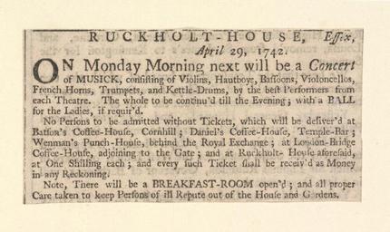 | Keywords: Bodleian Libraries, Ruckholt-House, Essex.jpg Newscutting relating to Ruckholt House April 29th 1742 announcing A concert of musick; Note There will be a Breakfast-Room open'd; and all proper care taken to keep persons of ill repute out of the House and Gardens ; Concert of musick; Ball for the ladies; Ruckholt-House Essex single sheet; 42 x 82 mm exhibition history On Monday morning next will be a concert of musick consisting of violins hautboys bassoons violoncellos French horns trumpets and kettle-drums by the best performers from each theatre Allegro identifier 20030603/16 46 56 hm object history object type Licensed-PD-Art PD-old-100 cc-by-4 0 place of creation place of discovery http //digital bodleian ox ac uk/inquire/p//4c643201-8035-4760-b54b-1a5d555205e5 Digital Bodleian Template John Johnson Ruckholt-House Essex Uploaded with GWToolset Bodleian Libraries Ruckholt-House Essex http //iiif bodleian ox ac uk/iiif/image/4c643201-8035-4760-b54b-1a5d555205e5/full/ 1000 1000/0/default jpg Files uploaded by the Bodleian Libraries' Wikimedian In Residence Concerts England--History--18th century Singing Instrumental music Violins Oboes Bassoons Cellos French horn Trumpets in art Drum Clippings |