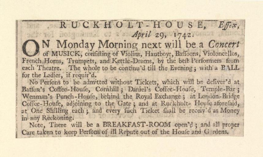 MAKE A MEME View Large Image Bodleian Libraries, Ruckholt-House, Essex.jpg Newscutting relating to Ruckholt House April 29th 1742 announcing A concert of musick; Note There will be a Breakfast-Room open'd; and all proper care taken to keep persons of ill repute out of ...
