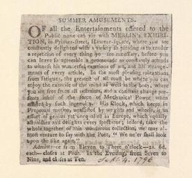 | Keywords: Bodleian Libraries, Summer amusements.jpg Newscutting relating to Princes-street September 4th 1796 announcing Merlin's Exhibition; Sept 4 1796 manuscript ; Merlin's Exhibition; Summer amusements single sheet; 65 x 66 mm exhibition history Of all the entertainments offered to the public none can vie with Merlin's Exhibition in Princes-street Hanover-square Allegro identifier 20030521/13 17 01 hm object history object type Licensed-PD-Art PD-old-100 cc-by-4 0 place of creation place of discovery http //digital bodleian ox ac uk/inquire/p//5786c017-3d15-4e8d-a3e4-41eb339b42a7 Digital Bodleian Template John Johnson Summer amusements Uploaded with GWToolset Bodleian Libraries Summer amusements http //iiif bodleian ox ac uk/iiif/image/5786c017-3d15-4e8d-a3e4-41eb339b42a7/full/ 1000 1000/0/default jpg Files uploaded by the Bodleian Libraries' Wikimedian In Residence Exhibitions Mechanical toys Clocks and watches Clippings mechanical curiousities |