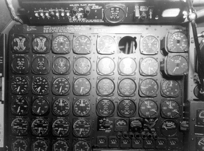 Keywords: Boeing B-50D flight engineer's upper panel, taken March 13, 1951 061025-F-1234S-047.jpg Boeing B-50D flight engineer's upper panel taken March 13 1951 US Goverment PD-USGov Cockpits of B-50 Superfortresses Flight engineering