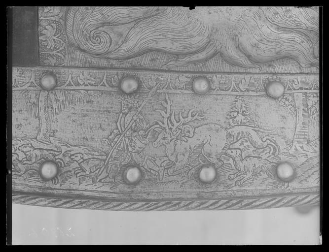 | Keywords: Bogpansar till hästrusning, troligen tillhörigt Johan III, 1500-tal - Livrustkammaren - 79454.tif LSH artwork sv Bestående av sammanlagt elva sammanfogade plåtar med utsidan dekorerad av etsat mönster och rött sammetstyg U-formigt böjt med svagt sluttande sidor och kraftigare sluttande framparti Ram av fyra skenor med ytterkanterna omvikta rundsmidda och djupt repstavsfilade Mittenpartiet utgörs av sju plåtar nitade vid varandra Samtliga nitar har ursprungligen haft brickor på insidan och kullriga mässingsskallar på utsidan Baktill och upptill i var kant ett brunt läderband med nio hål L 295 B 43 mm fäst med två nitar varav de två nedre med blomformig bricka av mässing Plåtarnas insidor är mörbruna längs övre och nedre kanten är nitarna fästade genom 20 mm breda läderband Ramen har heltäckande etsad dekor På övre delen slingrande växtrankor och mytologiska figurer som kentaurer på nedre delen jaktscener med jägare hästar jakthundar och villebråd som hjortar vildsvin och harar På plåtarna som utgör bakre gavlarna finns större motiv På den ena stryper en stående Herakles det nemeiska lejonet under scenen ruta med texten HERKVLES På andra sidan man med långt skägg svärd samt rustning all'antica därunder textruta IOS APHAI Av de sju mittenplåtarna är nr 2 7 drivna och punsade som lejonhuvuden i hög relief med graverade detaljer som hår ögon och tänder Den främsta nr 4 har etsad Herkules med lejonmantel i färd att kasta omkull en fiende nertill textruta HERKVLES Övriga plåtar är helt täckta av pålimmad mörkröd sammet original caption century 16 velvet Färg mörkt röd material sammet - leather Färg brun material läder - brass Färg gul material mässing - steel g 6450 size mm 720 690 357 LRK Johan III av Sverige Tre Konungar på Åbo slott 1993 Björneborg - Johans stad Satakunta Museum Björneborg/Pori 2008 Trofast - hov och tass i kunglig tjänst 2010-2011 Livrustkammaren Trogna vänner - Kungliga hästar och hundar 2011-2012 Museiverket/Finlands nationalmuseum place of origin original filename LN_E02855 59503 inventory number LRK 22861 79454 CC0 Bogpansar till hästrusning troligen tillhörigt Johan III 1500-tal - Livrustkammaren - 79454-negative tif <gallery caption Different images of same object > File Bogpansar till hästrusning troligen tillhörigt Johan III 1500-tal - Livrustkammaren - 44085 tif File Bogpansar till hästrusning troligen tillhörigt Johan III 1500-tal - Livrustkammaren - 35526 tif File Utställningsbild sadlar hästrustningar mm - Livrustkammaren - 77173 tif </gallery> <gallery caption Related objects > File Manpansar möjligen tillhörigt Johan III 1500-talets mitt - Livrustkammaren - 19537 tif LRK 22860 File Ländpansar till hästrustning troligen tillhörigt Johan III 1500-tal - Livrustkammaren - 79460 tif LRK 22862 File Manpansar möjligen tillhörigt Johan III 1500-talets mitt - Livrustkammaren - 36657 tif LRK 22860 File Manpansar möjligen tillhörigt Johan III 1500-talets mitt - Livrustkammaren - 62337 tif LRK 22860 File Ländpansar till hästrustning troligen tillhörigt Johan III 1500-tal - Livrustkammaren - 70895 tif LRK 22862 File Manpansar möjligen tillhörigt Johan III 1500-talets mitt - Livrustkammaren - 70899 tif LRK 22860 File Ländpansar till hästrustning troligen tillhörigt Johan III 1500-tal - Livrustkammaren - 36659 tif LRK 22862 File Manpansar möjligen tillhörigt Johan III 1500-talets mitt - Livrustkammaren - 79458 tif LRK 22860 File Manpansar möjligen tillhörigt Johan III 1500-talets mitt - Livrustkammaren - 53776 tif LRK 22860 File Ländpansar till hästrustning har troligen tillhört Johan III 1500-tal - Livrustkammaren - 10975 tif LRK 22862 File Ländpansar till hästrustning troligen tillhörigt Johan III 1500-tal - Livrustkammaren - 2415 tif LRK 22862 File Manpansar möjligen tillhörigt Johan III 1500-talets mitt - Livrustkammaren - 45215 tif LRK 22860 File Manpansar möjligen tillhörigt Johan III 1500-talets mitt - Livrustkammaren - 10973 tif LRK 22860 File Manpansar möjligen tillhörigt Johan III 1500-talets mitt - Livrustkammaren - 28096 tif LRK 22860 File Manpansar möjligen tillhörigt Johan III 1500-talets mitt - Livrustkammaren - 2413 tif LRK 22860 File Manpansar möjligen tillhörigt Johan III 1500-talets mitt - Livrustkammaren - 35519 tif LRK 22860 </gallery> Horse armours Media contributed by LSH 2016-12 |