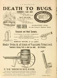 | Keywords: Bolgiano's 1902 catalogue (16348288701).jpg 4 2 <br> F W BOLGIANO CO <br> DEATH TO BUGS <br> HAMMOND'S SLUG SHOT <br> 5 pounds 25c <br> 1 1 pounds l50c <br> i r pounds 1 00 <br> – <br> BUG DEATH <br> Just th2 thing to kill them <br> 1 pound 15c <br> S pounds 55c <br> 5 pounds 50c <br> 12; pounds 1 00 <br> Pat March 16 and Nov <br> Pat in Canada Nov 2 1897 <br> and Jan 2 1000 <br> W IE1 <br> GUARANTEED PURE <br> At the Lowest Market Price <br> Knapsack and Hand Sprayers <br> It is Economy to use these Implements <br> THEY REQUIRE LESS <br> PARIS GREEN OR BORDEAUX MIXTURE <br> AND DO BETTER WORK <br> Price - 50c up <br> BORDEAUX MIXTURE 1 per gallon <br> Binder Twine all kinds of Vegetable Tying Cord <br> Twemlow's Glazing Putty is what you need Get Circulars <br> The Barrel can easily l o detached from Truck or tilted to <br> empty contents Either Barrel Leaf Rack or Box can be used <br> Truck and Trunion with i l / 2 inch wheel 6 50 ; 2 / 2 inch wheel 7 25 ; <br> 3 ' inch wheel 8 00 Extra for Barrel 2 25 Box to fit on Truck 3 00 <br> Leaf Rack to fit on Truck £5 00 Sprinkler Attachment 55 25 <br> 2-JETS PRAY 42156292 132756 65911 Page 42 Text http //www biodiversitylibrary org/page/42156292 1902 10 5962/bhl title 65911 F W Bolgiano Co ; Henry G Gilbert Nursery and Seed Trade Catalog Collection Biodiversity Heritage Library Bolgiano's 1902 catalogue tested seeds for the garden and farm Garden Stories Bulbs Plants Catalogs Fruit Garden tools Nurseries Horticulture Seeds Vegetables U S Department of Agriculture National Agricultural Library bhl page 42156292 dc identifier http //biodiversitylibrary org/page/42156292 bhlGardenStories BHLinbloom bulbs plants nurseries horticulture u s department of agriculture national agricultural library bhlgardenstories bhlinbloom Information field Flickr posted date ISOdate 2015-01-23 Check categories 2015 August 24 CC-BY-2 0 BioDivLibrary https //flickr com/photos/61021753 N02/16348288701 2015-08-24 08 50 25 cc-by-2 0 PD-old-70-1923 Bolgiano's 1902 catalogue Photos uploaded from Flickr by Fæ using a script |