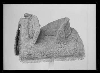 | Keywords: Bomsadel, Frankrike, 1650-talet av isabellafärgad sammet - Livrustkammaren - 44341.tif Sadel klädd med beige-färgad isabellafärgad sammet med hela yttäckande broderi med silvertråd och pärlor i rankor och palmetter Rektangulära kappor med frans I varje hörn en konturerad krönt vapensköld i relief med Karl X Gustavs namnchiffer C G R S Däremellan utmed nederkanten och framkanten strödda stora kronor <br/><br/>Sitsen med glesare broderi med en längsgående kavelfrans utmed mitten <br/><br/>Höga bommar bakbom h 120 mm b 520 mm med stödbommar Frambom h 100 mm b 460 mm <br/><br/>Sadelknapp av försilvrad mässing framåt utdragen räfflad <br/><br/>Framför frambommen 8 + 9 silvertännlikor bakom bakbommen 10 + 2 likadana tännlikor Framtill söljor för förbygel Baktill sölja för ryggstycke Fyra stroppar av vitt läder för sadelgjord Två byglar av stål för stigbyglar original caption decade 1650 velvet Färg beige material sammet - silver thread size mm 560 size mm 280 sits g 6450 LRK Karl X Gustav av Sverige Hästen 2003-2004 Silver - Makt o prakt i barockens Sverige 2003-2004 C G R S Karl X Gustav av Sverige C G R S Karl X Gustav av Sverige place of origin original filename LN_B12515_015395 48182 inventory number LRK 11578 44341 CC0 Bomsadel Frankrike 1650-talet av isabellafärgad sammet - Livrustkammaren - 44341-negative tif <gallery caption Different images of same object > File Bomsadel Frankrike 1650-talet av isabellafärgad sammet - Livrustkammaren - 35783 tif File Bomsadel - Livrustkammaren - 8482 tif File Bomsadel Frankrike 1650-talet av isabellafärgad sammet - Livrustkammaren - 27222 tif </gallery> Saddles Media contributed by LSH dim-with multiple size templates Horse tack images from Livrustkammaren Media contributed by LSH 2013-10 |