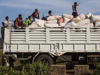 Keywords: Arbetare och beväpnad vakt et afar bilar fordon fält lastbilar etiopien platserspecifika bomullsfält platserallmänna