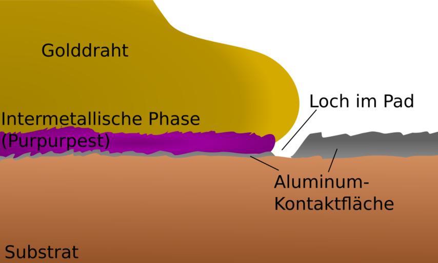 | Keywords: Bondkontakt Gold-Aluminium.svg en Schematic representation of a gold-aluminum bonding contact with an intermetallic phase purple plague de Schematische Darstellung eines Gold-Aluminium-Bondkontakts mit der Ausprägung einer intermetallischen Phase Purpurpest own Cepheiden 2010-04-17 Gold-aluminium intermetallic svg Wire bonding |