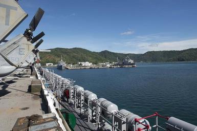 | Keywords: Bonhomme Richard ARG arrives in Malaysia for port visit 121022-N-XY604-035.jpg en Amphibious transport dock ship USS Denver LPD 9 left and amphibious dock landing ship USS Tortuga LSD 46 right are moored pier side as amphibious assault ship USS Bonhomme Richard LHD 6 arrives in Kota Kinabalu for a scheduled port visit The Bonhomme Richard Amphibious Ready Group ARG commanded by Capt Cathal S O'Connor is comprised of amphibious assault ship USS Bonhomme Richard LHD 6 amphibious dock landing ship USS Tortuga LSD 46 and amphibious transport dock ship USS Denver LPD 9 and is currently operating in the 7th Fleet Area of Responsibility <br>Unit Amphibious Squadron 11 2012-10-22 Petty Officer 3rd Class Karen Blankenship https //www dvidshub net/image/765243/bonhomme-richard-arg-arrives-malaysia-port-visit 121022-N-XY604-035 2012-10-22 09 43 KOTA KINABALU MY PD-USGov-Military-Navy USS Tortuga LSD-46 USS Bonhomme Richard LHD-6 USS Denver LPD-9 Images from DoD uploaded by Fæ |