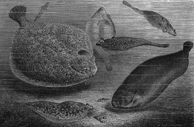 | Keywords: BonyFlatfish.jpg A 19th century wood engraving depicting various species of bony flatfish The large fish on the left is a turbot The one closest to the right is a sole The fully visible one resting on the bottom is a plaice From Tierleben by en Alfred Edmund Brehm 19th century wood engraving of bony flatfish including turbot sole and plaice ~ 1865 Tierleben Alfred Edmund Brehm PD-old en Category Pleuronectiformes images original upload log page en wikipedia BonyFlatfish jpg '1' Upload date User Bytes Dimensions Comment - nowrap 2004-12-03 02 03 20 nowrap Johnstone nowrap 88287 nowrap 581×381 <small><nowiki>A 19th century wood engraving depicting various species of bony flatfish </nowiki></small> Food industry Fish food Pleuronectiformes Engravings of fish |
