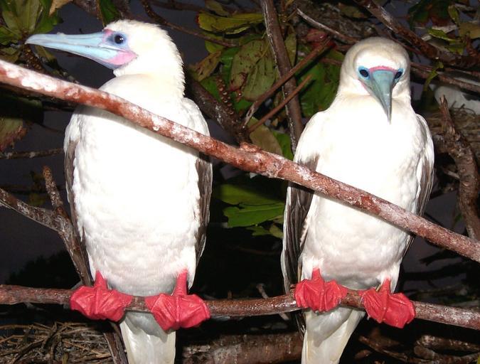 | Keywords: BoobyFaceRedFeet.jpg en Red-footed Boobies nest within small trees during the night Note the vivid red colouring of the legs and webbed feet These adults have characteristic pale blue and pink facial markings Coral Sea islands Australia own Gsh1967 2002-09-26 Sula sula Coral Sea Islands |