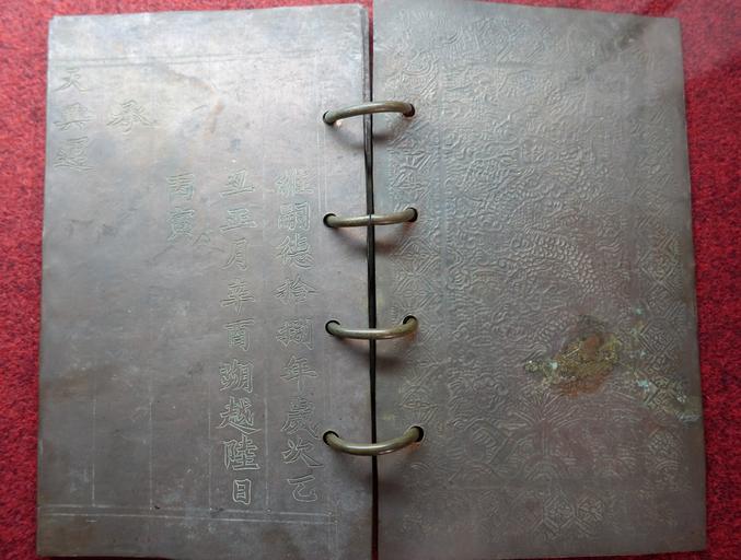 | Keywords: Book, posthumously bestowing title of Duke of Phu Binh to Nguyen Phuc Mien Ao by King Tu Duc, 1865, copper - Museum of Vietnamese History - Ho Chi Minh City - DSC05954.JPG en Exhibit in the Museum of Vietnamese History Ho Chi Minh City Vietnam This work is old enough so that it is in the public domain Photography was permitted in the museum without restriction 2014-08-07 03 15 17 own Daderot other versions cc-zero Uploaded with UploadWizard Metalwork in the Museum of Vietnamese History Emperor Tự Đức |