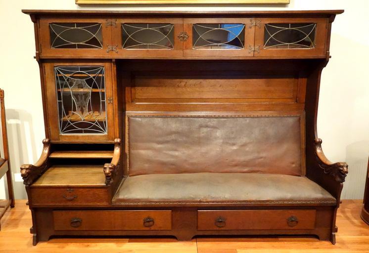 | Keywords: Bookcase settle, designed by Frederick H. Meyer, made by Stanley Kopersky, c. 1904, oak, glass, lead - De Young Museum - DSC00705.JPG en Exhibit in the De Young Museum San Francisco California USA This artwork is in the public domain because it was first published in the United States before 1923 Photography was permitted in the museum without restriction 2013-11-05 15 49 17 own Daderot other versions PD-1923 cc-zero Furniture in the De Young Museum Uploaded with UploadWizard Frederick Heinrich Wilhelm Meyer |