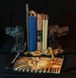 Keywords: bookends bronze dogs old books door latch gilt king tut tutankhanun mask