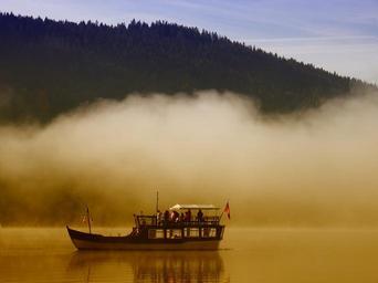 Keywords: boot ferry black forest lake titisee germany fog clouds autumn mood
