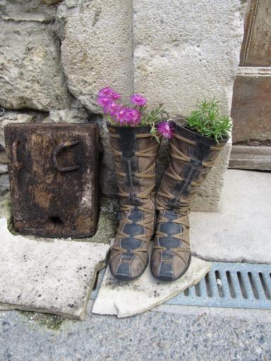 Keywords: boots flowers plants stones wall block wood lilac purple