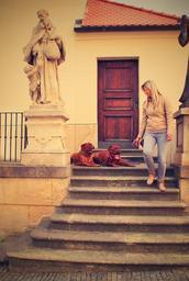 Keywords: bordeaux de dogue street mastiffs french two pet dog nature big collar puppy pavement outdoor europe outside city guard huge paving the alley brno czech republic animal my friend the guardian of the czech stairs statuary church girl