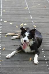 Keywords: border collie wooden bridge lying dog summer