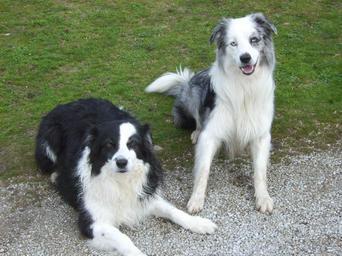 Keywords: Border NB et Merle.JPG Photo de 2 border collie 1 noir et blanc et 1 bleu merle Jlpeter 6/8/2006 Jean-Louis Petermann Border Collie Canine M locus Two dogs