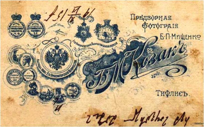 | Keywords: Boris Kozak's photographic stamp. Tiflis. 1915 (ბორის კოზაკის ფოტოსტუდიის შტამპი. ტფილისი. 1915 წ.).jpg en B Kozak's photographic stamp Tiflis 1915 ka ბ რის კ ზაკის ფ ტ სტუდიის შტამპი ტფილისი 1915 წ http //www photomuseum org ge/photographers/kozak/01 jpg www photomuseum org ge Boris Kozak 1915 Source http //www photomuseum org ge/photographers/kozak/kozak_en htm www photomuseum org ge en <br> http //www photomuseum org ge/photographers/kozak/kozak_ge htm www photomuseum org ge ge PD-old Photographic stamps in Georgia Photos of Boris Kozak 1915 in Tbilisi |