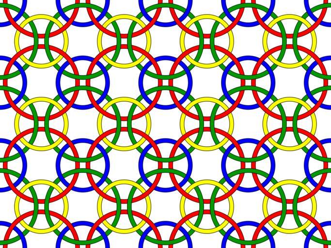 | Keywords: Borromean-chainmail-tile.svg Borromean chain-mail -- an indefinitely extended pattern in which each small circle is part of four Borromean rings configurations and each large circle is part of eight Borromean rings configurations so that every area contained within circles of three different colors is at the center of a Borromean rings configuration and no two circles are directly linked To free a yellow or blue loop two red loops or two green loops must be cut To free a red or green loop four other loops must be cut Borromean-chainmail-tile png 2010-01-18 03 12 UTC Borromean-chainmail-tile png AnonMoos derivative work McSush <span class signature-talk >talk</span> Other fields + RetouchedPicture redrawn as svg image McSush Borromean-chainmail-tile png Backdrop tiles Circular Borromean rings Knots in art and decoration Linked circle patterns Outline knots and links |