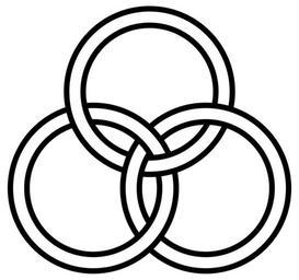 | Keywords: Borromean-rings minimal-overlap.svg The Borromean rings configuration of knot theory depicted using same-size circles without an area enclosed by all three circles For a depiction with central overlap see Image BorromeanRings svg etc For configurations of three linked rings which are not Borromean see File Two-representations-of-L6n1-link-as-linked-circles svg Self-made graphic converted from a version of the following vector PostScript source code <pre> 300 282 translate/plr dup 3 2 roll 72 mul 90 add dup 3 1 roll cos mul 3 1 roll sin mul def 23 1130905 setlinewidth /A 0 5 4 4 5 100 plr 78 0 360 arc closepath stroke for 0 182 plr 78 0 360 arc closepath stroke def A 11 5565453 setlinewidth 1 setgray A showpage EOF</pre> 2009 AnonMoos Borromean rings Outline knots and links Knots and links on transparent background Circular Borromean rings 3 component links 6 crossing number knots and links Alternating knots and links 9 stick number knots and links Images with PostScript source code |