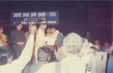 Keywords: Bose accepting award.jpg en Vijay Bose accepting Academy samman -2001 from the then Governer of UP Acharya Vishnu Kant Shastri jie own Basukamal 10 9 2001 Cc-zero Theatre directors from India 1927 births All India Radio People of Allahabad