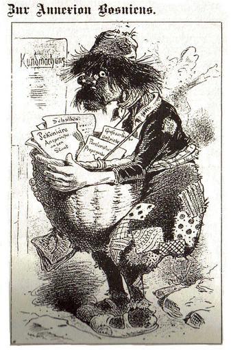 | Keywords: Bosniake2.jpg en Caricature of a Bosnian in the Austrian humourous magazin Kikeriki 1908 de Karikatur eines Bosniers in der österreichischen humoristischen Wochenschrift Kikeriki anlässlich der Annexion Bosnien-Herzegowinas durch die Donaumonarchie 1908 Bildunterschrift Gott sei Dank jetzt g'hört er ganz uns <br> Die Zettel im Korb beziehen sich auf Bosnien und tragen die Aufschriften Schulden Pekuniäre Ansprüche an den Staat Panslawistische Propaganda Großserbische Umtriebe <br> Source Kikeriki Jg 48 1908 Nr 83 v 15 Oktober 1908 Titelblatt 1908 cartoons 1900s political cartoons People of Bosnia and Herzegovina Bosnian Crisis Kikeriki PD-Art Artworks missing infobox template |