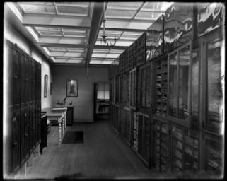 | Keywords: field columbian museum chicago blackandwhite monochrome alley warehouse black and white Botany Herbarium and workspace for curator's office, 2nd floor balcony gallery area. Skylight visible. Wood cabinets with glass doors contain herbarium specimen sheets. Photograph hanging on wall, two ceiling light fixtures, microscope [verify] in the far back is on a counter. Field Columbian Museum. 1899. Original size and material: 3 1/2 x 4 inch Lantern Slide Digital Identifier: CSB8459 Part of the Illinois Urban Landscapes Project: www.fieldmuseum.org/urbanlandscapes/ Botany Herbarium and workspace for curator's office, 2nd floor balcony gallery area. Skylight visible. Wood cabinets with glass doors contain herbarium specimen sheets. Photograph hanging on wall, two ceiling light fixtures, microscope [verify] in the far back is on a counter. Field Columbian Museum. 1899. Original size and material: 3 1/2 x 4 inch Lantern Slide Digital Identifier: CSB8459 Part of the Illinois Urban Landscapes Project: www.fieldmuseum.org/urbanlandscapes/ |