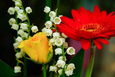 Keywords: bouquet flowers pink marguerite lily of the valley thrush bells